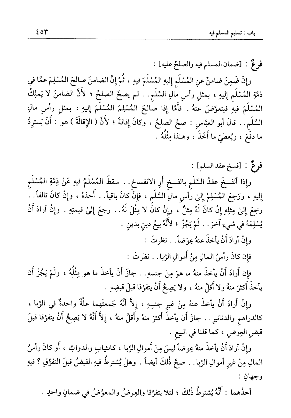 ] : وإذا انفسخ عقد السلم بالفسخ أو الانفساخ.. سقط المسلم فيه عن ذمة المسلم إليه، ورجع المسلم إلى رأس مال السلم، فإن كان باقيًا.. أخذه، وإن كان تالفًا.. رجع إلى مثله إن كان له مثل، وإن كان لا مثل له.. رجع إلى قيمته. وإن أراد أن يسلمه في شيء آخر.. لم يجز؛ لأنه بيع دين بدين.