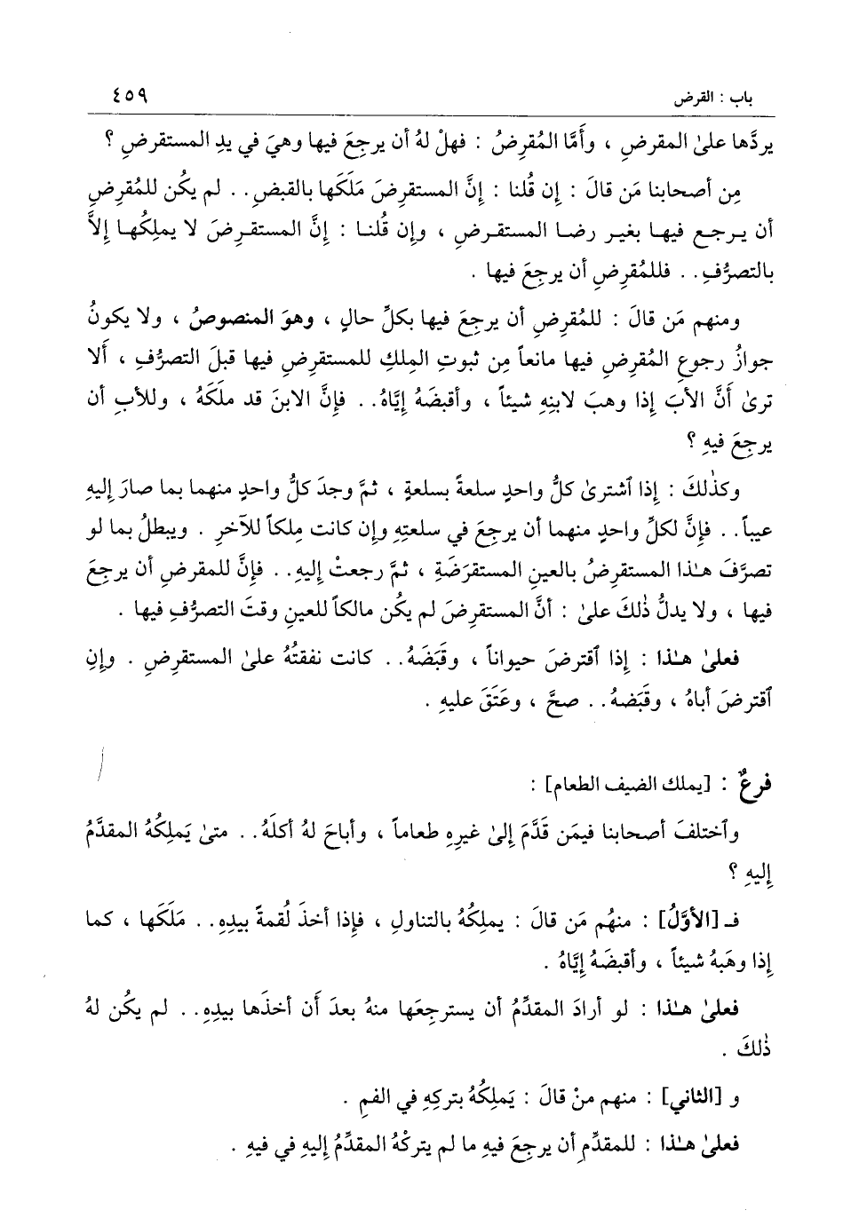 وكذلك: إذا اشترى كل واحد سلعة بسلعة، ثم وجد كل واحدٍ منهما بما صار إليه عيبًا.. فإن لكل واحد منهما أن يرجع في سلعته وإن كانت ملكًا للآخر. ويبطل بما لو تصرَّف هذا المستقرض بالعين المستقرضة، ثم رجعت إليه.. فإن للمقرض أن يرجع فيها، ولا يدلُّ ذلك على: أنَّ المستقرض لم يكن مالكًا للعين وقت التصرُّف فيها. فعلى هذا: إذا اقترض حيوانًا، وقبضه.. كانت نفقته على المستقرض. وإن اقترض أباه، وقبضه.. صحَّ، وعتق عليه.