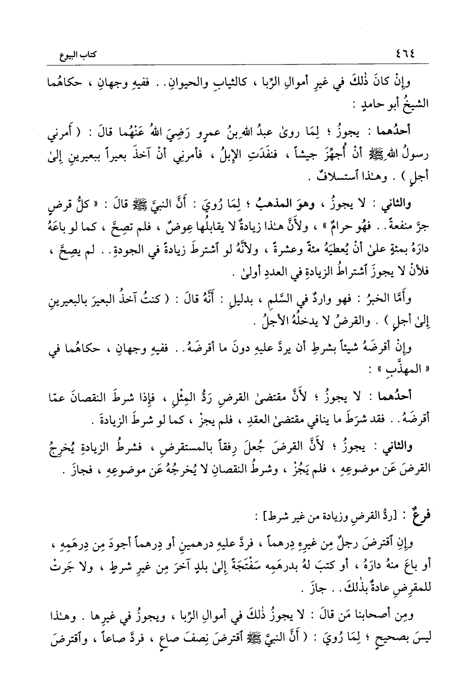 ومن أصحابنا من قال: لا يجوز ذلك في أموال الرِّبا، ويجوز في غيرها. وهذا ليس بصحيح؛ لما روي: «أن النبي - صَلَّى اللَّهُ عَلَيْهِ وَسَلَّمَ - اقترض نصف صاع، فرد صاعًا، واقترض