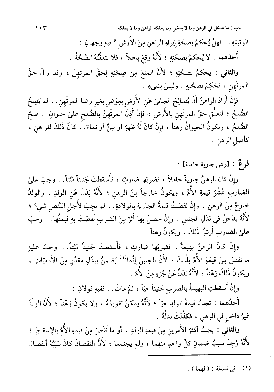 وإن كان الرهن جارية حاملا، فضربها ضارب، فأسقطت جنينا ميتا.. وجب على الضارب عشر قيمة الأم، ويكون خارجا من الرهن؛ لأنه بدل عن الولد، والولد خارج من الرهن. وإن نقصت قيمة الجارية بالولادة.. لم يجب لأجل النقص شيء؛ لأنه يدخل في بدل الجنين. وإن حصل بها أثر من الضرب نقصت به قيمتها.. وجب على الضارب أرش ذلك، ويكون رهنا.