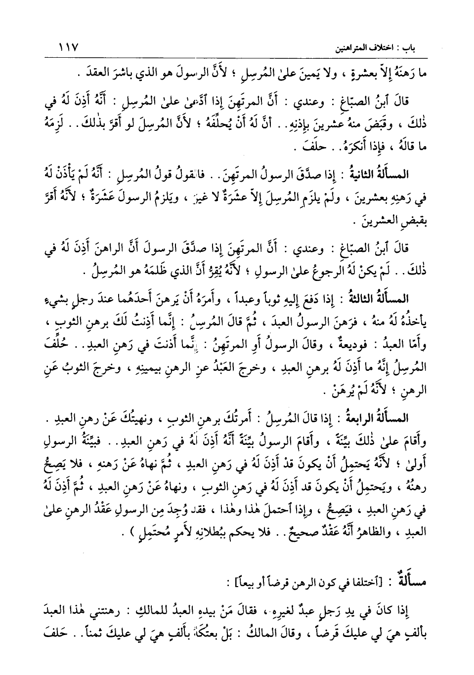 المسألة الرابعة: إذا قال المرسل: أمرتك برهن الثوب، ونهيتك عن رهن العبد. وأقام على ذلك بينة، وأقام الرسول بينة أنه أذن له في رهن العبد. فبينة الرسول أولى؛ لأنه يحتمل أن يكون قد أذن له في رهن العبد، ثم نهاه عن رهنه، فلا يصح رهنه، ويحتمل أن يكون قد أذن له في رهن الثوب، ونهاه عن رهن العبد، ثم أذن له في رهن العبد، فيصح، وإذا احتمل هذا وهذا، فقد وجد من الرسول عقد الرهن على العبد، والظاهر أنه عقد صحيح.. فلا يحكم ببطلانه لأمر محتمل) .