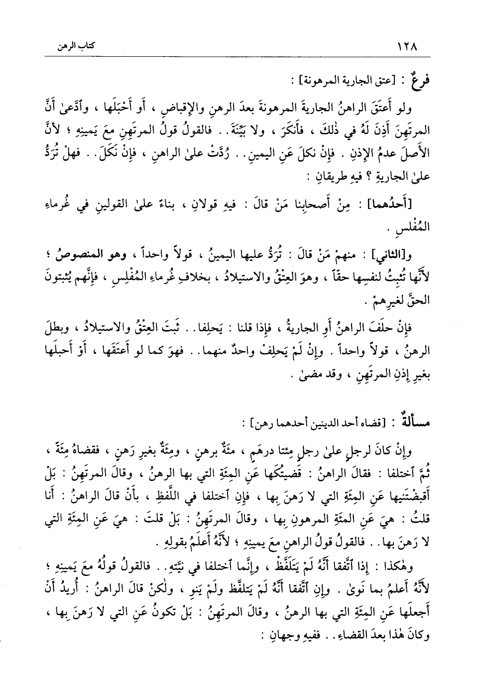 ولو أعتق الراهن الجارية المرهونة بعد الرهن والإقباض، أو أحبلها، وادعى أن المرتهن أذن له في ذلك، فأنكر، ولا بينة.. فالقول قول المرتهن مع يمينه؛ لأن الأصل عدم الإذن. فإن نكل عن اليمين.. ردت على الراهن، فإن نكل.. فهل ترد على الجارية؟ فيه طريقان: