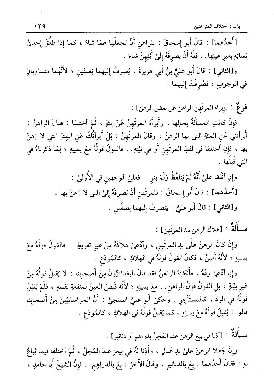 وإن ادعى رده، فأنكره الراهن فقد قال البغداديون من أصحابنا: لا يقبل قوله من غير بينة، بل القول قول الراهن.. مع يمينه؛ لأنه قبض العين لمنفعة نفسه، فلم يقبل قوله في الرد، كالمستأجر. وحكى أبو علي السنجي: أن الخراسانيين من أصحابنا قالوا: يقبل قوله مع يمينه، كما يقبل قوله في الهلاك، كالمودع.