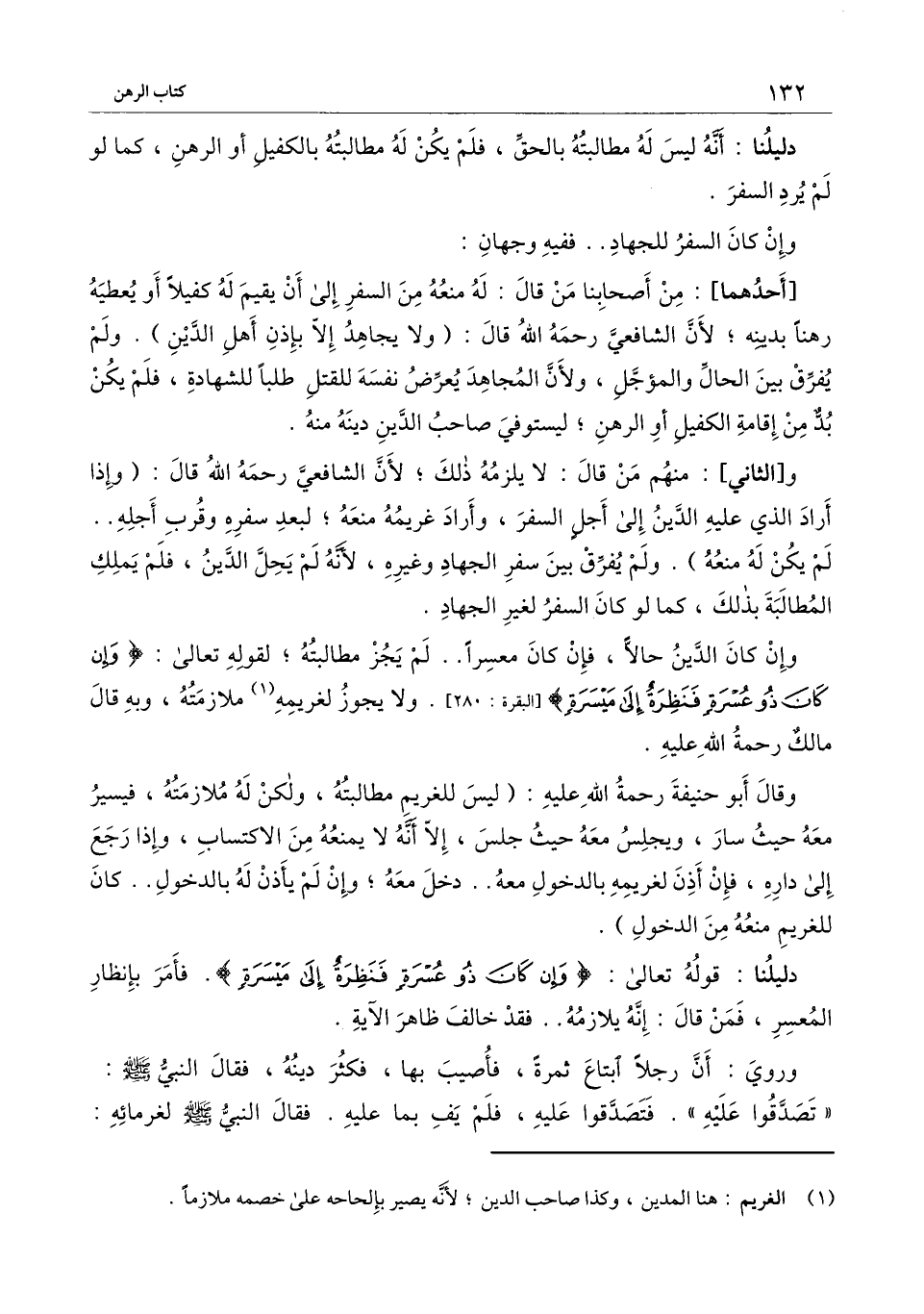 و [الثاني] : منهم من قال: لا يلزمه ذلك؛ لأن الشافعي - رَحِمَهُ اللَّهُ - قال: (وإذا أراد الذي عليه الدين إلى أجل السفر، وأراد غريمه منعه؛ لبعد سفره وقرب أجله.. لم يكن له منعه) . ولم يفرق بين سفر الجهاد وغيره، لأنه لم يحل الدين، فلم يملك المطالبة بذلك، كما لو كان السفر لغير الجهاد.