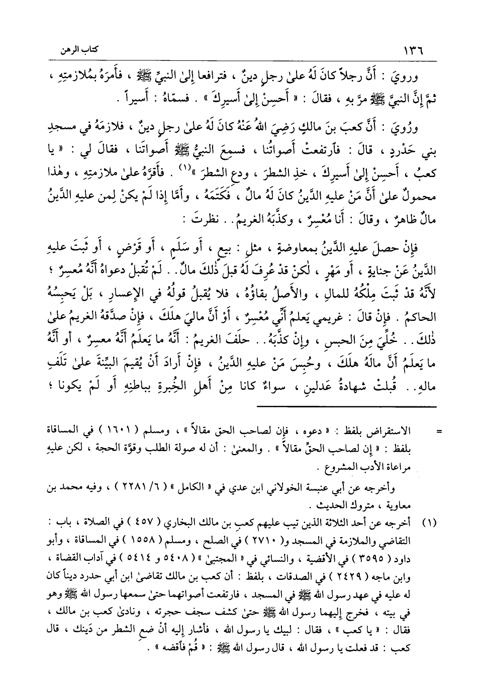 وروي: «أن كعب بن مالك - رَضِيَ اللَّهُ عَنْهُ - كان له على رجل دين، فلازمه في مسجد بني حدرد، قال: فارتفعت أصواتنا، فسمع النبي - صَلَّى اللَّهُ عَلَيْهِ وَسَلَّمَ - أصواتنا، فقال لي: يا كعب، أحسن إلى أسيرك، خذ الشطر، ودع الشطر» فأقره على ملازمته، وهذا محمول على أن من عليه الدين كان له مال، فكتمه، وأما إذا لم يكن لمن عليه الدين مال ظاهر، وقال: أنا معسر، وكذبه الغريم.. نظرت: