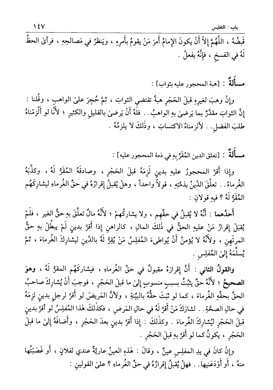 والقول الثاني: أن إقراره مقبول في حق الغرماء، فيشاركهم المقر له، وهو الصحيح؛ لأنه حق يثبت بسبب منسوب إلى ما قبل الحجر، فوجب أن يشارك صاحب الحق بحقه الغرماء، كما لو ثبت حقه بالبينة، ولأن المريض لو أقر لرجل بدين لزمه في حال الصحة. لشارك من أقر له في حال المرض، فكذلك هذا المفلس لو أقر بدين قبل الحجر ليشارك الغرماء. وكذلك: إذا أقر بدين بعد الحجر، وإضافة إلى ما قبل الحجر، يكون كما لو أقر به قبل الحجر.