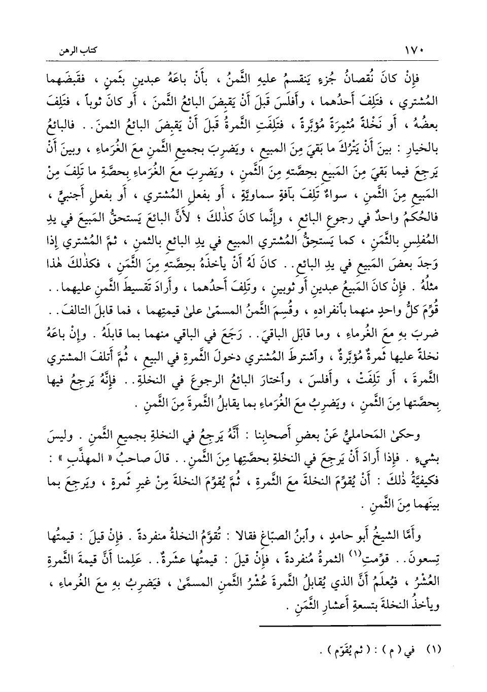 فإن كان نقصان جزء ينقسم عليه الثمن، بأن باعه عبدين بثمن، فقبضهما المشتري، فتلف أحدهما، وأفلس قبل أن يقبض البائع الثمن.. أو كان ثوبا فتلف بعضه أو نخلة مثمرة مؤبرة فتلفت الثمرة قبل أن يقبض البائع الثمن فالبائع بالخيار: بين أن يترك ما بقي من المبيع، ويضرب بجميع الثمن مع الغرماء، وبين أن يرجع فيما بقي من المبيع بحصته من الثمن، ويضرب مع الغرماء بحصة ما تلف من المبيع من الثمن، سواء تلف بآفة سماوية، أو بفعل المشتري، أو بفعل أجنبي، فالحكم واحد في رجوع البائع، وإنما كان كذلك؛ لأن البائع يستحق المبيع في يد المفلس بالثمن، كما يستحق المشتري المبيع في يد البائع بالثمن، ثم المشتري إذا وجد بعض المبيع في يد البائع.. كان له أن يأخذه بحصته من الثمن، فكذلك هذا مثله. فإن كان المبيع عبدين أو ثوبين، وتلف أحدهما، وأراد تقسيط الثمن عليهما.. قوم كل واحد منهما بانفراده، وقسم الثمن المسمى على قيمتهما، فما قابل التالف.. ضرب به مع الغرماء، وما قابل الباقي.. رجع في الباقي منهما بما قابله. وإن باعه نخلة عليها ثمرة مؤبرة، واشترط المشتري دخول الثمرة في البيع، ثم أتلف المشتري الثمرة، أو تلفت، وأفلس، واختار البائع الرجوع في النخلة.. فإنه يرجع فيها بحصتها من الثمن، ويضرب مع الغرماء بما يقابل الثمرة من الثمن.