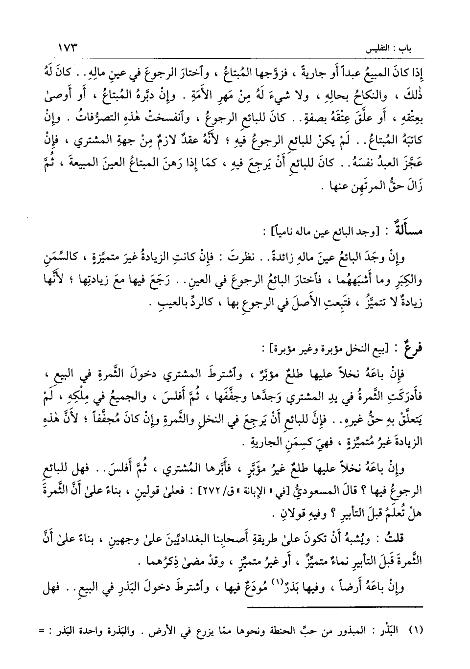 وإن باعة نخلا عليها طلع غير مؤبر، فأبرها المشتري، ثم أفلس.. فهل للبائع الرجوع فيها؟ قال المسعودي (في (الإبانة) ق \ 272) : فعلى قولين، بناء على أن الثمرة هل تعلم قبل التأبير؟ وفيه قولان.