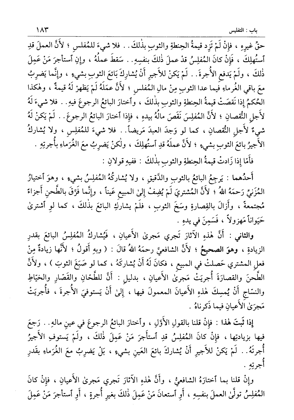 حق غيره، فإن لم تزد قيمة الحنطة والثوب بذلك.. فلا شيء للمفلس؛ لأن العمل قد استهلك، فإن كان المفلس قد عمل ذلك بنفسه.. سقط عمله، وإن استأجر من عمل ذلك، ولم يدفع الأجرة.. لم يكن للأجير أن يشارك بائع الثوب بشيء، وإنما يضرب مع باقي الغرماء فيما عدا الثوب من مال المفلس؛ لأن عمله لم يظهر له قيمة، وهكذا الحكم إذا نقصت قيمة الحنطة والثوب بذلك، واختار البائع الرجوع فيه.. فلا شيء له لأجل النقصان؛ لأن المفلس نقص ماله بيده، فإذا اختار البائع الرجوع.. لم يكن له شيء لأجل النقصان، كما لو وجد العبد مريضا.. فلا شيء للمفلس، ولا يشارك الأجير بائع الثوب بشيء؛ لأن عمله قد استهلك، ولكن يضرب مع الغرماء بأجرته.