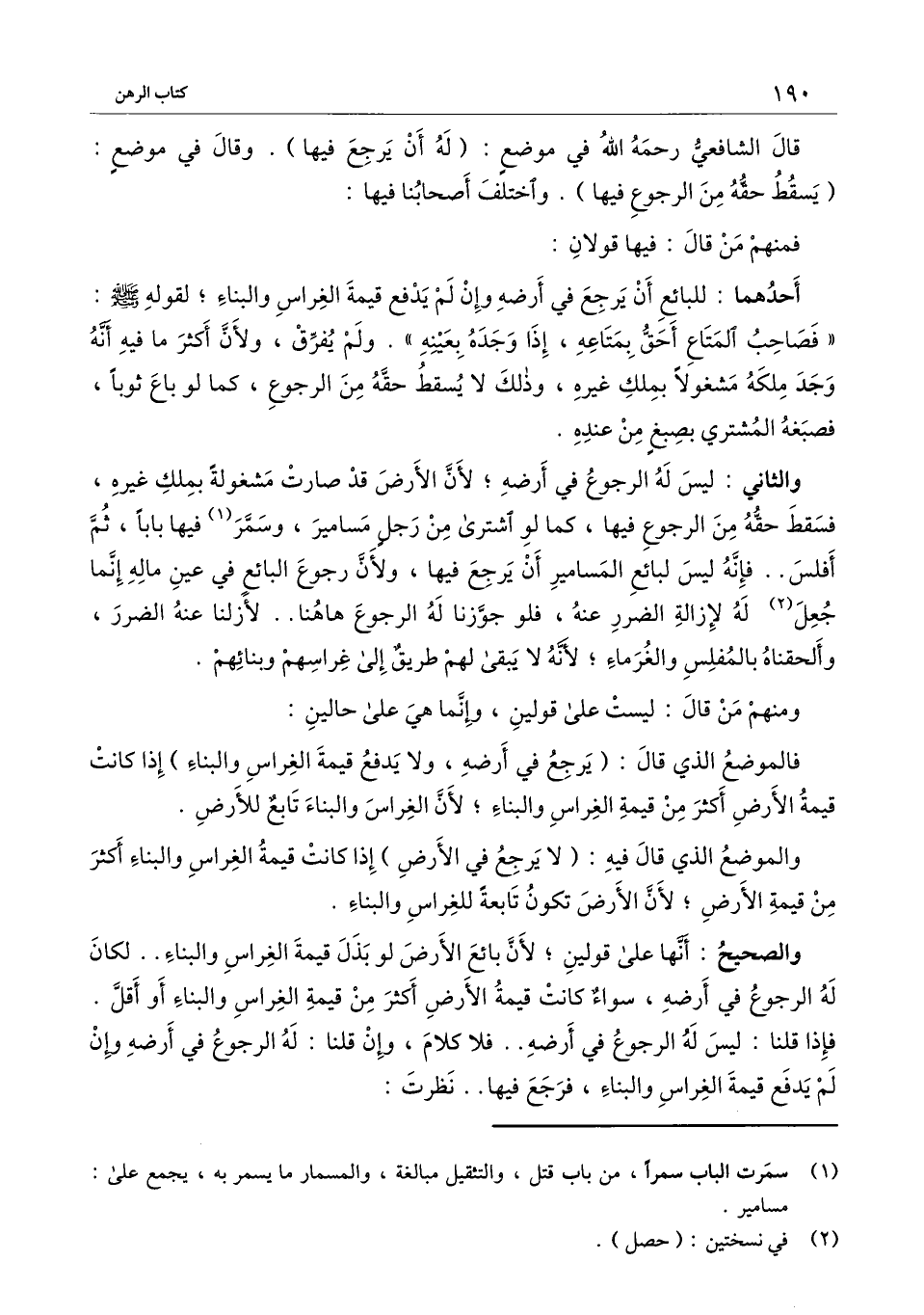 والثاني: ليس له الرجوع في أرضه؛ لأن الأرض قد صارت مشغولة بملك غيره، فسقط حقه من الرجوع فيها، كما لو اشترى من رجل مسامير، وسمر فيها بابا، ثم أفلس.. فإنه ليس لبائع المسامير أن يرجع فيها، ولأن رجوع البائع في عين ماله إنما جعل له لإزالة الضرر عنه، فلو جوزنا له الرجوع هاهنا.. لأزلنا عنه الضرر، وألحقناه بالمفلس والغرماء؛ لأنه لا يبقى لهم طريق إلى غراسهم وبنائهم.