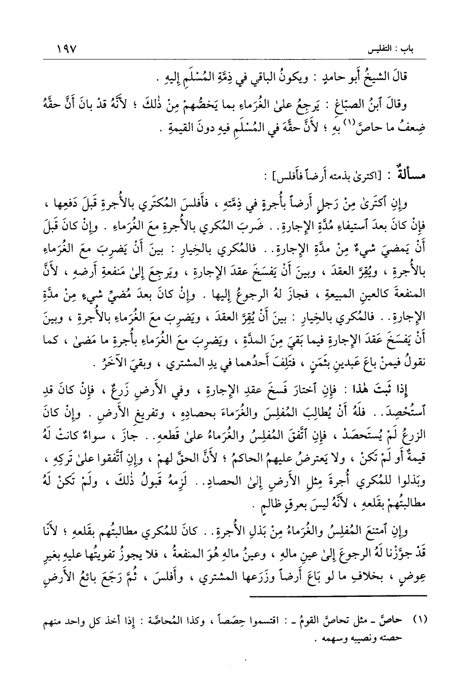 وإن اكترى من رجل أرضا بأجرة في ذمته، فأفلس المتكري بالأجرة قبل دفعها، فإن كان بعد استيفاء مدة الإجارة.. ضرب المكري بالأجرة مع الغرماء. وإن كان قبل أن يمضي شيء من مدة الإجارة.. فالمكري بالخيار: بين أن يضرب مع الغرماء بالأجرة، ويقر العقد، وبين أن يفسخ عقد الإجارة، ويرجع إلى منفعة أرضه، لأن المنفعة كالعين المبيعة، فجاز له الرجوع إليها. وإن كان بعد مضي شيء من مدة الإجارة.. فالمكري بالخيار: بين أن يقر العقد، ويضرب مع الغرماء بالأجرة، وبين أن يفسخ عقد الإجارة فيما بقي من المدة، ويضرب مع الغرماء بأجرة ما مضى، كما نقول فيمن باع عبدين بثمن، فتلف أحدهما في يد المشتري، وبقي الآخر.