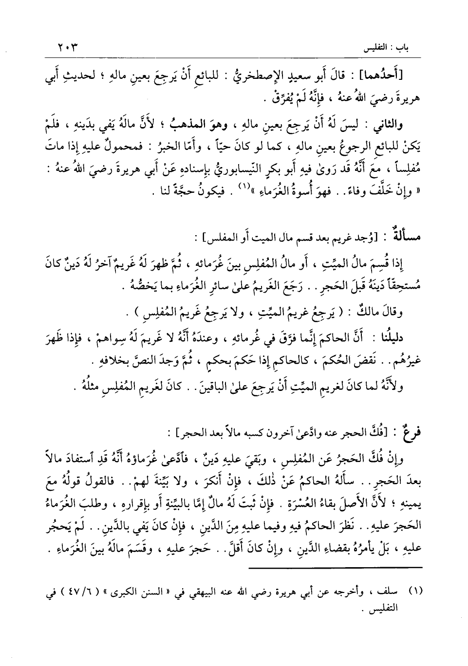 [أحدهما] : قال أبو سعيد الإصطخري: للبائع أن يرجع بعين ماله؛ لحديث أبي هريرة - رَضِيَ اللَّهُ عَنْهُ -، فإنه لم يفرق.