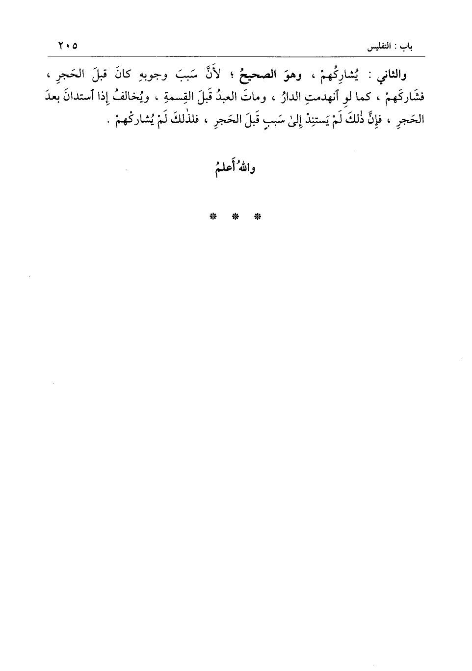والثاني: يشاركهم، وهو الصحيح؛ لأن سبب وجوبه كان قبل الحجر، فشاركهم، كما لو انهدمت الدار، ومات العبد قبل القسمة، ويخالف إذا استدان بعد الحجر، فإن ذلك لم يستند إلى سبب قبل الحجر، فلذلك لم يشاركهم.