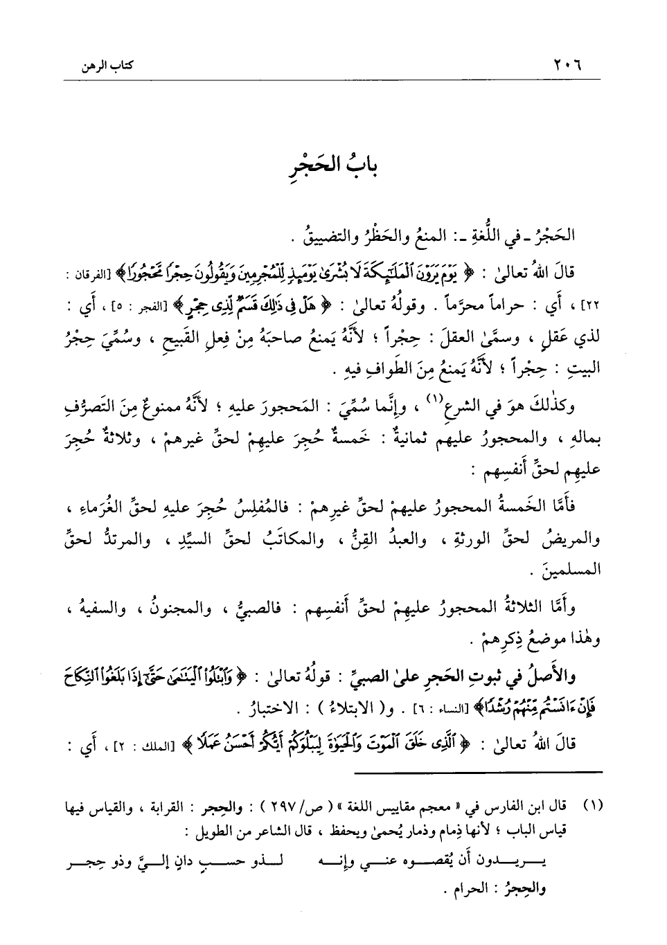 قال الله تعالى: {يَوْمَ يَرَوْنَ الْمَلائِكَةَ لا بُشْرَى يَوْمَئِذٍ لِلْمُجْرِمِينَ وَيَقُولُونَ حِجْرًا مَحْجُورًا} [الفرقان: 22] [الفرقان: 22] ، أي: حراما محرما. وقَوْله تَعَالَى {هَلْ فِي ذَلِكَ قَسَمٌ لِذِي حِجْرٍ} [الفجر: 5] [الفجر: 5] ، أي: لذي عقل، وسمى العقل: حجرا؛ لأنه يمنع صاحبه من فعل القبيح، وسمي حجر البيت: حجرا؛ لأنه يمنع من الطواف فيه.