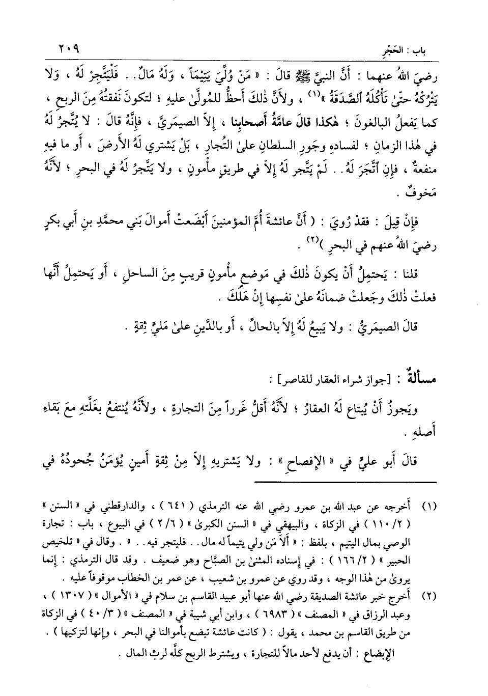 - رَضِيَ اللَّهُ عَنْهُمَا -: أن النبي - صَلَّى اللَّهُ عَلَيْهِ وَسَلَّمَ - قال: «من ولي يتيما، وله مال.. فليتجر له، ولا يتركه حتى تأكله الصدقة» ، ولأن ذلك أحظ للمولى عليه؛ لتكون نفقته من الربح، كما يفعل البالغون؛ هكذا قال عامة أصحابنا، إلا الصيمري، فإنه قال: لا يتجر له في هذا الزمان؛ لفساده وجور السلطان على التجار، بل يشتري له الأرض، أو ما فيه منفعة، فإن اتجر له.. لم يتجر له إلا في طريق مأمون، ولا يتجر له في البحر؛ لأنه مخوف.