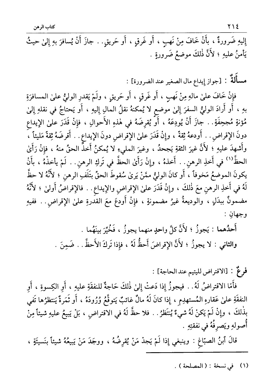 مسألة: [جواز إيداع مال الصغير عند الضرورة] . فإن خاف على ماله من نهب، أو غرق، أو حريق، ولم يقدر الولي على المسافرة به، أو أراد الولي السفر إلى موضع لا يمكنه نقل المال إليه، أو يحتاج في نقله إلى مؤنة مجحفة.. جاز أن يودعه، أو يقرضه في هذه الأحوال، فإن قدر على الإيداع دون الإقراض.. أودعه ثقة، وإن قدر على الإقراض دون الإيداع.. أقرضه ثقة مليئا، وأشهد عليه؛ لأن غير الثقة يجحد، وغير المليء لا يمكن أخذ الحق منه، فإن رأى الحظ في أخذ الرهن.. أخذه، وإن رأى الحظ في ترك الرهن.. لم يأخذه، بأن يكون الموضع مخوفا، أو كان الولي ممن يرى سقوط الحق بتلف الرهن؛ لأنه لا حظ له في أخذ الرهن مع ذلك، وإن قدر على الإقراض والإيداع.. فالإقراض أولى؛ لأنه مضمون ببدل، والوديعة غير مضمونة، فإن أودع مع القدرة على الإقراض.. ففيه وجهان:
