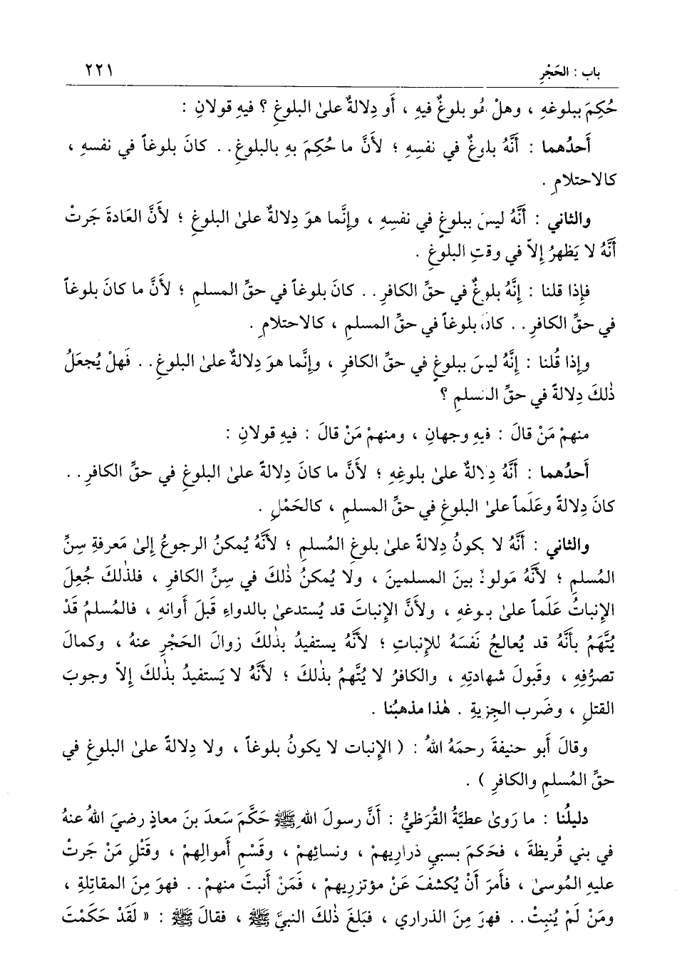 حكم ببلوغه، وهل هو بلوغ فيه، أو دلالة على البلوغ؟ فيه قولان:
