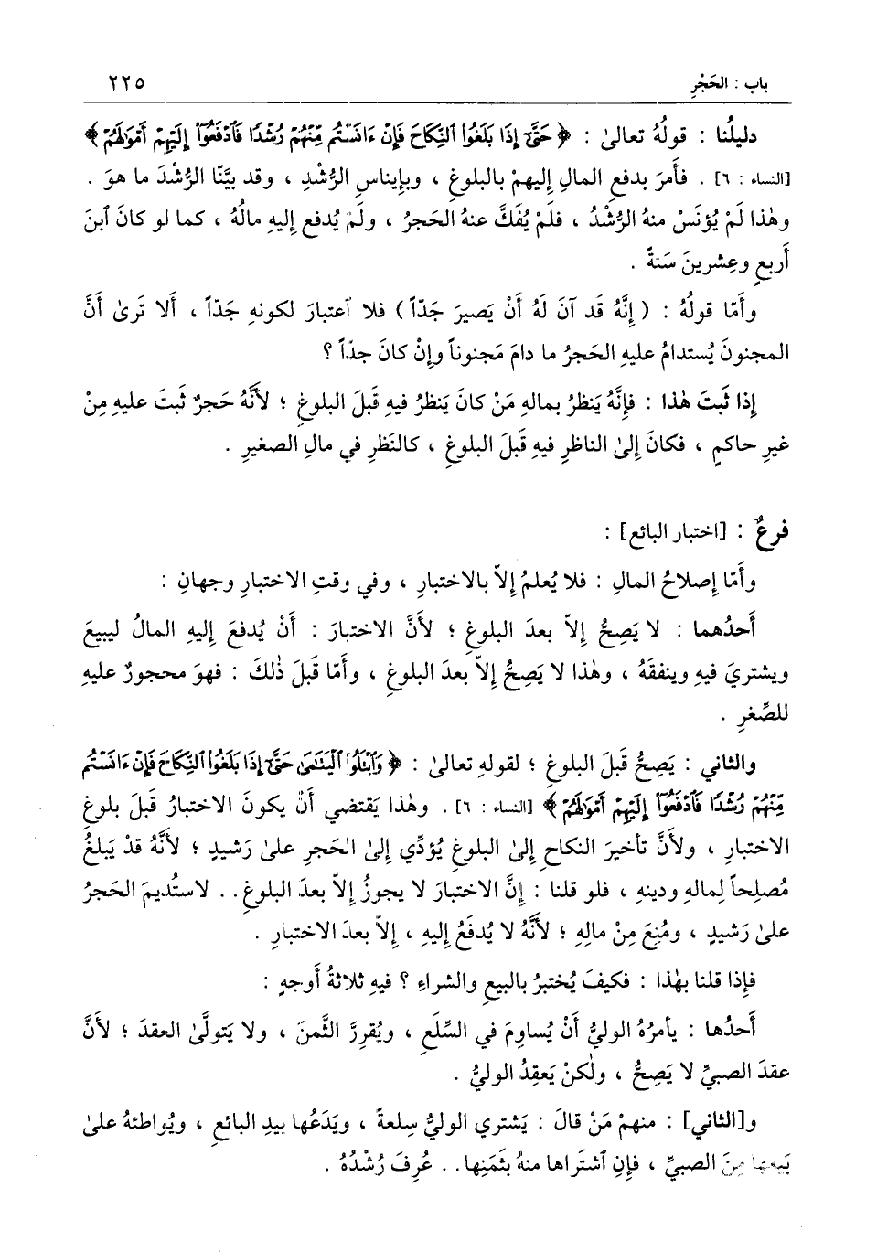 والثاني: يصح قبل البلوغ؛ لِقَوْلِهِ تَعَالَى: {وَابْتَلُوا الْيَتَامَى حَتَّى إِذَا بَلَغُوا النِّكَاحَ فَإِنْ آنَسْتُمْ مِنْهُمْ رُشْدًا فَادْفَعُوا إِلَيْهِمْ أَمْوَالَهُمْ} [النساء: 6] [النساء: 6] . وهذا يقتضي أن يكون الاختبار قبل بلوغ الاختبار، ولأن تأخير النكاح إلى البلوغ يؤدي إلى الحجر على رشيد؛ لأنه قد يبلغ مصلحا لماله ودينه، فلو قلنا: إن الاختبار لا يجوز إلا بعد البلوغ.. لاستديم الحجر على رشيد، ومنع من ماله؛ لأنه لا يدفع إليه، إلا بعد الاختبار.