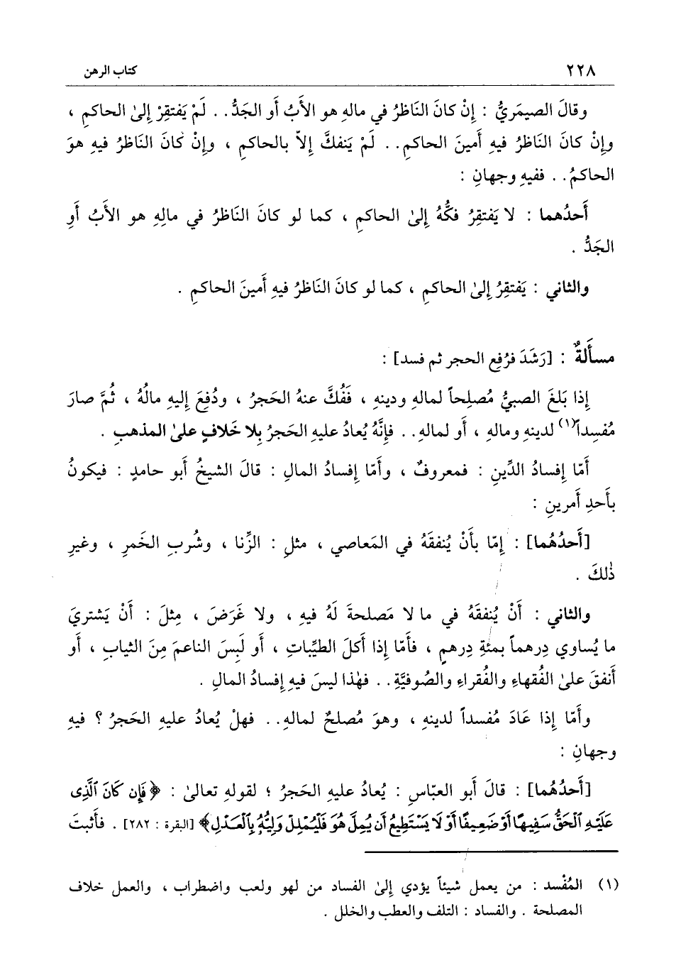 ] : إذا بلغ الصبي مصلحا لماله ودينه، ففك عنه الحجر، ودفع إليه ماله، ثم صار مفسدا لدينه وماله، أو لماله.. فإنه يعاد عليه الحجر بلا خلاف على المذهب.