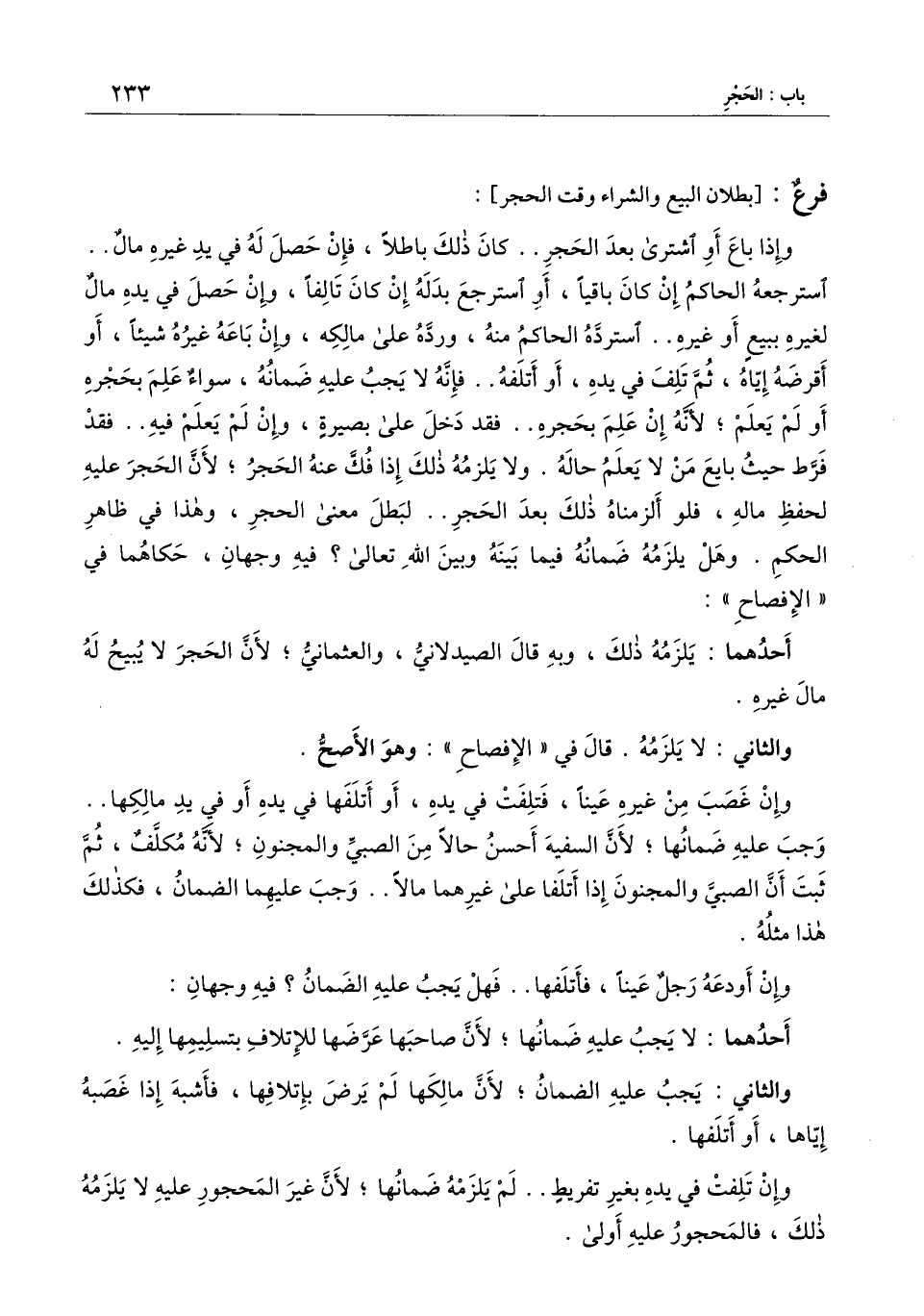 ] : وإذا باع أو اشترى بعد الحجر.. كان ذلك باطلا، فإن حصل له في يد غيره مال.. استرجعه الحاكم إن كان باقيا، أو استرجع بدله إن كان تالفا، وإن حصل في يده مال لغيره ببيع أو غيره.. استرده الحاكم منه، ورده على مالكه، وإن باعه غيره شيئا، أو أقرضه إياه، ثم تلف في يده، أو أتلفه.. فإنه لا يجب عليه ضمانه، سواء علم بحجره أو لم يعلم؛ لأنه إن علم بحجره.. فقد دخل على بصيرة، وإن لم يعلم فيه.. فقد فرط حيث بايع من لا يعلم حاله. ولا يلزمه ذلك إذا فك عنه الحجر؛ لأن الحجر عليه لحفظ ماله، فلو ألزمناه ذلك بعد الحجر.. لبطل معنى الحجر، وهذا في ظاهر الحكم. وهل يلزمه ضمانه فيما بينه وبين الله تعالى؟ فيه وجهان، حكاهما في " الإفصاح ":