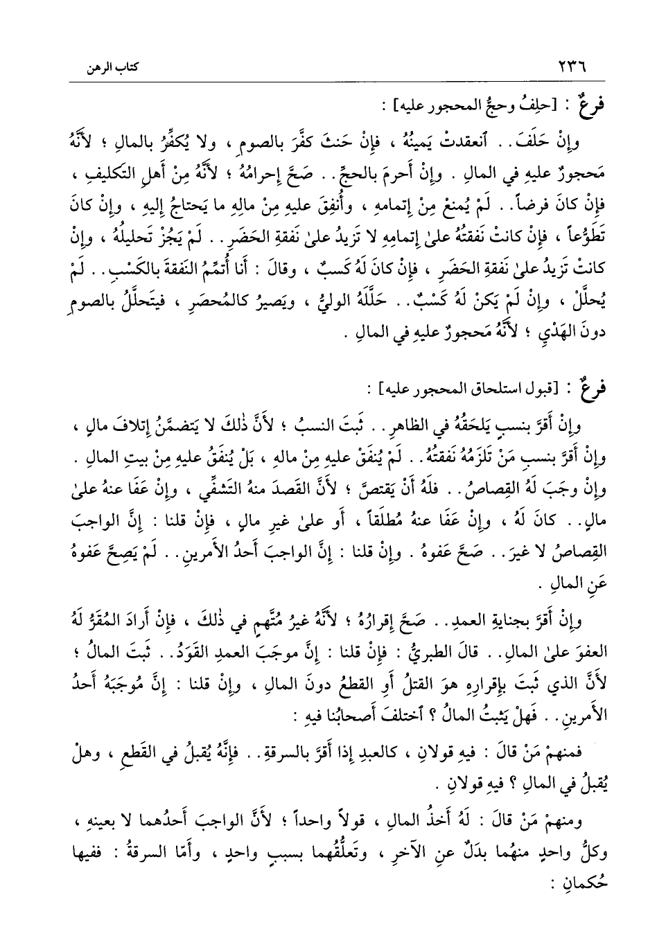 وإن حلف.. انعقدت يمينه، فإن حنث كفر بالصوم، ولا يكفر بالمال؛ لأنه محجور عليه في المال. وإن أحرم بالحج.. صح إحرامه؛ لأنه من أهل التكليف، فإن كان فرضا.. لم يمنع من إتمامه، وأنفق عليه من ماله ما يحتاج إليه، وإن كان تطوعا، فإن كانت نفقته على إتمامه لا تزيد على نفقة الحضر.. لم يجز تحليله، وإن كانت تزيد على نفقة الحضر، فإن كان له كسب، وقال: أنا أتمم النفقة بالكسب.. لم يحلل، وإن لم يكن له كسب.. حلله الولي، ويصير كالمحصر، فيتحلل بالصوم دون الهدي؛ لأنه محجور عليه في المال.