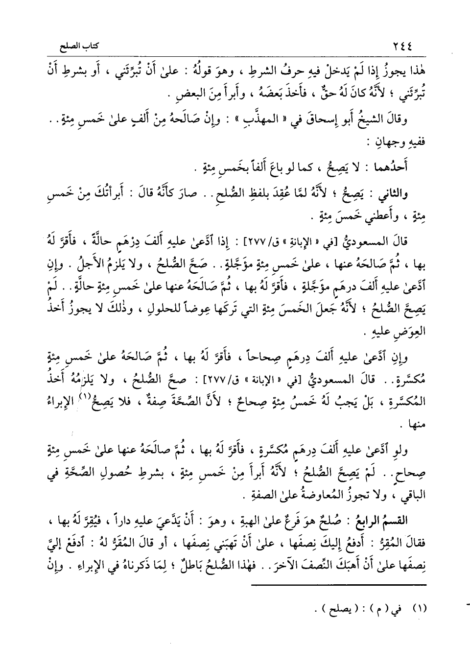 القسم الرابع: صلح هو فرع على الهبة، وهو: أن يدعي عليه دارا، فيقر له بها، فقال المقر: أدفع إليك نصفها، على أن تهبني نصفها، أو قال المقر له: ادفع إلي نصفها على أن أهبك النصف الآخر.. فهذا الصلح باطل؛ لما ذكرناه في الإبراء. وإن