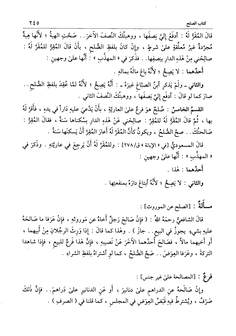القسم الخامس: صلح هو فرع على العارية، بأن يدعي عليه دارا في يده، فأقر له بها، ثم قال المقر له للمقر: صالحني عن هذه الدار بسكناها سنة، فقال المقر: صالحتك.. صح الصلح، ويكون كأن المقر له أعار المقر أن يسكنها سنة.