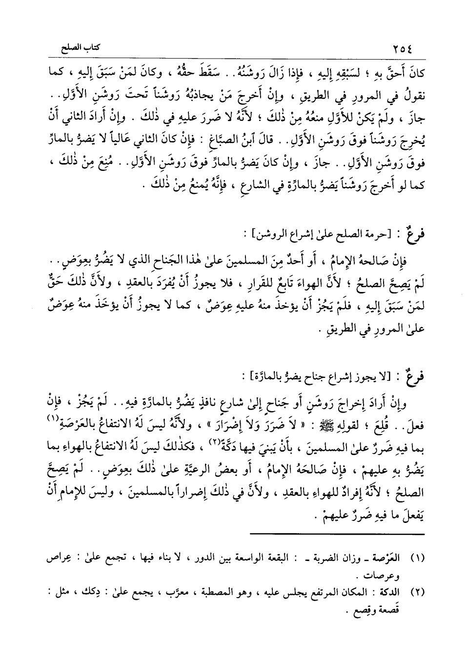 وإن أراد إخراج روشن أو جناح إلى شارع نافذ يضر بالمارة فيه.. لم يجز، فإن فعل. قلع؛ لقوله - صَلَّى اللَّهُ عَلَيْهِ وَسَلَّمَ -: «لا ضرر ولا إضرار» ، ولأنه ليس له الانتفاع بالعرصة بما فيه ضرر على المسلمين، بأن يبني فيها دكة، فكذلك ليس له الانتفاع بالهواء بما يضر به عليهم، فإن صالحه الإمام، أو بعض الرعية على ذلك بعوض.. لم يصح الصلح؛ لأنه إفراد للهواء بالعقد، ولأن في ذلك إضرارا بالمسلمين، وليس للإمام أن يفعل ما فيه ضرر عليهم.
