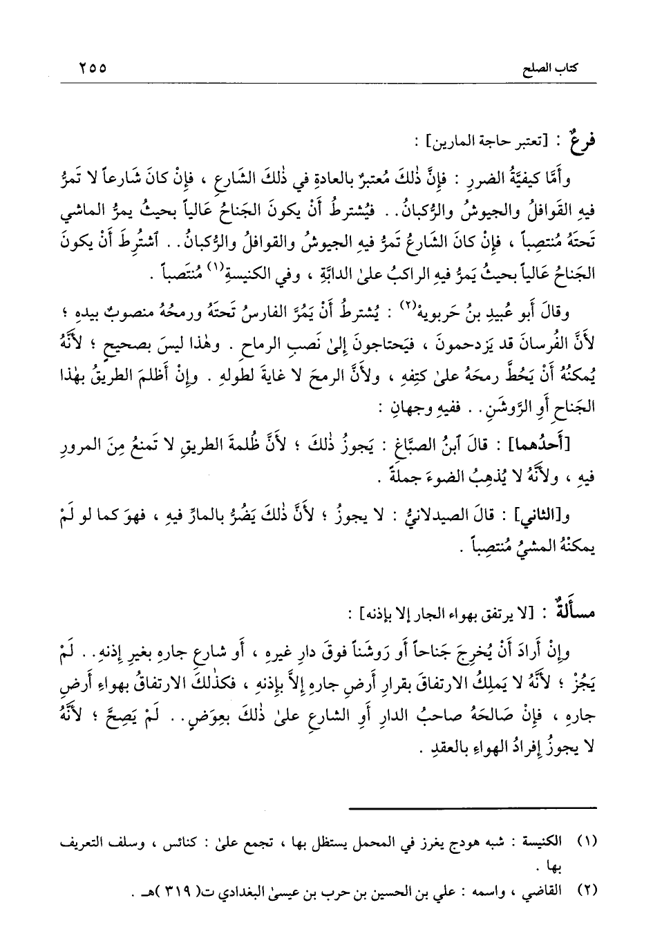 وأما كيفية الضرر: فإن ذلك معتبر بالعادة في ذلك الشارع، فإن كان شارعا لا تمر فيه القوافل والجيوش والركبان.. فيشترط أن يكون الجناح عاليا بحيث يمر الماشي تحته منتصبا فإن كان الشارع تمر فيه الجيوش والقوافل والركبان.. اشترط أن يكون الجناح عاليا بحيث يمر فيه الراكب على الدابة، وفي الكنيسة منتصبا.