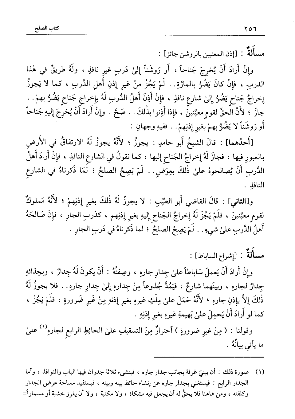 و [الثاني] : قال القاضي أبو الطيب: لا يجوز له ذلك بغير إذنهم؛ لأنه مملوك لقوم معينين، فلم يجز له إخراج الجناح إليه بغير إذنهم، كدرب الجار، فإن صالحه أهل الدرب على شيء.. لم يصح الصلح؛ لما ذكرناه في درب الجار.