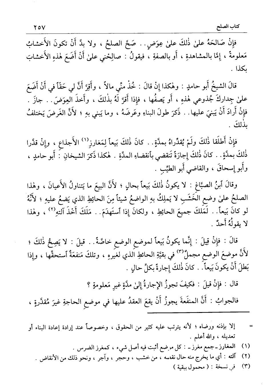 وقال ابن الصباغ: لا يكون ذلك بيعا بحال؛ لأن البيع ما يتناول الأعيان، وهذا الصلح على وضع الخشب لا يملك به الواضع شيئا من الحائط الذي يضع عليه؛ لأنه لو كان بيعا.. لملك جميع الحائط، ولكان إذا استهدم.. ملك أخذ آلته، وهذا لا يقوله أحد.