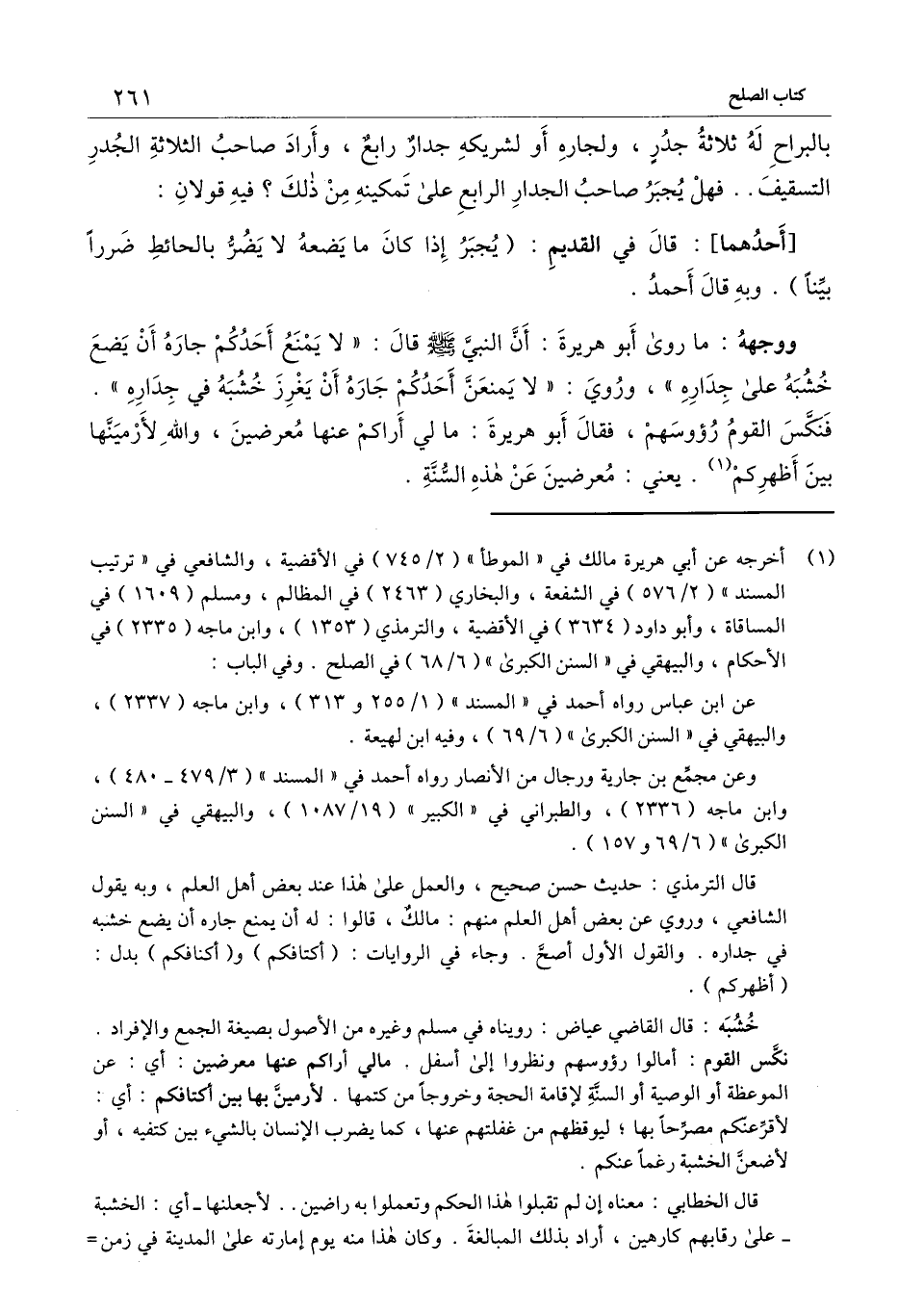 ووجهه: ما روى أبو هريرة: أن النبي - صَلَّى اللَّهُ عَلَيْهِ وَسَلَّمَ - قال: «لا يمنع أحدكم جاره أن يضع خشبه على جداره» ، وروي: «لا يمنعن أحدكم جاره أن يغرز خشبه في جداره» .