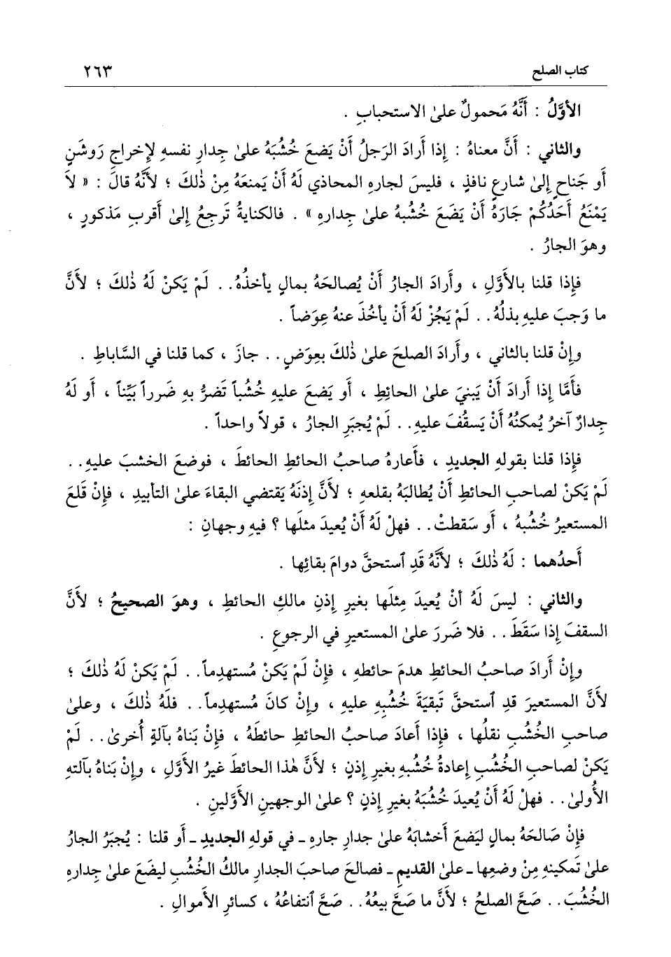 والثاني: أن معناه: إذا أراد الرجل أن يضع خشبه على جدار نفسه لإخراج روشن أو جناح إلى شارع نافذ، فليس لجاره المحاذي له أن يمنعه من ذلك؛ لأنه قال: " لا يمنع أحدكم جاره أن يضع خشبه على جداره ". فالكناية ترجع إلى أقرب مذكور، وهو الجار.