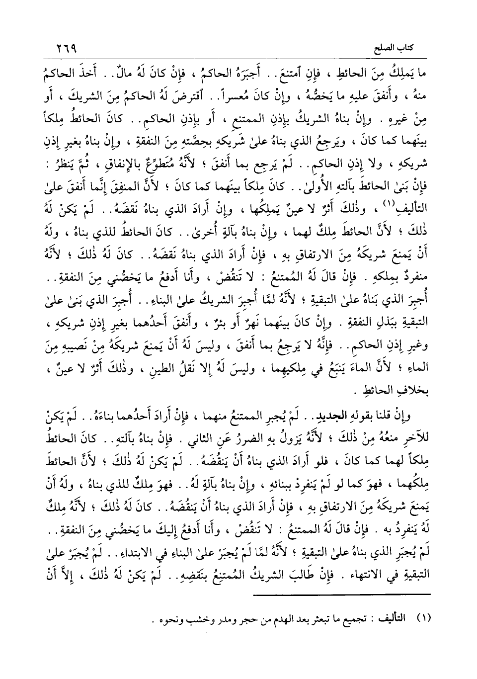 ما يملك من الحائط، فإن امتنع.. أجبره الحاكم، فإن كان له مال.. أخذ الحاكم منه، وأنفق عليه ما يخصه، وإن كان معسرا.. اقترض له الحاكم من الشريك، أو من غيره. وإن بناه الشريك بإذن الممتنع، أو بإذن الحاكم.. كان الحائط ملكا بينهما كما كان، ويرجع الذي بناه على شريكه بحصته من النفقة، وإن بناه بغير إذن شريكه، ولا إذن الحاكم.. لم يرجع بما أنفق؛ لأنه متطوع بالإنفاق، ثم ينظر: فإن بنى الحائط بآلته الأولى.. كان ملكا بينهما كما كان؛ لأن المنفق إنما أنفق على التأليف، وذلك أثر لا عين يملكها، وإن أراد الذي بناه نقضه.. لم يكن له ذلك؛ لأن الحائط ملك لهما، وإن بناه بآلة أخرى.. كان الحائط للذي بناه، وله أن يمنع شريكه من الارتفاق به، فإن أراد الذي بناه نقضه.. كان له ذلك؛ لأنه منفرد بملكه. فإن قال له الممتنع: لا تنقض، وأنا أدفع ما يخصني من النفقة.. أجبر الذي بناه على التبقية؛ لأنه لما أجبر الشريك على البناء.. أجبر الذي بنى على التبقية ببذل النفقة. وإن كان بينهما نهر أو بئر، وأنفق أحدهما بغير إذن شريكه، وغير إذن الحاكم.. فإنه لا يرجع بما أنفق، وليس له أن يمنع شريكه من نصيبه من الماء؛ لأن الماء ينبع في ملكيهما، وليس له إلا نقل الطين، وذلك أثر لا عين، بخلاف الحائط.