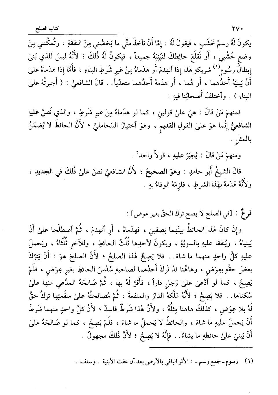 ] : وإن كان هذا الحائط بينهما نصفين، فهدماه، أو انهدم، ثم اصطلحا على أن يبنياه، وينفقا عليه بالسوية، ويكون لأحدهما ثلث الحائط، وللآخر ثلثاه، ويحمل عليه كل واحد منهما ما شاء.. فلا يصح هذا الصلح؛ لأن الصلح هو: أن يترك بعض حقه بعوض، وهاهنا قد ترك أحدهما لصاحبه سدس الحائط بغير عوض، فلم يصح، كما لو ادعى على رجل دارا، فأقر له بها، ثم صالحه المدعي منها على سكناها.. فلا يصح؛ لأنه ملكه الدار والمنفعة، ثم مصالحته على منفعتها ترك حق له بلا عوض، كذلك هاهنا مثله، ولأن هذا شرط فاسد؛ لأن كل واحد منهما شرط أن يحمل عليه ما شاء، والحائط لا يحمل ما شاء، فلم يصح، كما لو صالحه على أن يبني على حائطه ما يشاء.. فإنه لا يصح؛ لأن ذلك مجهول