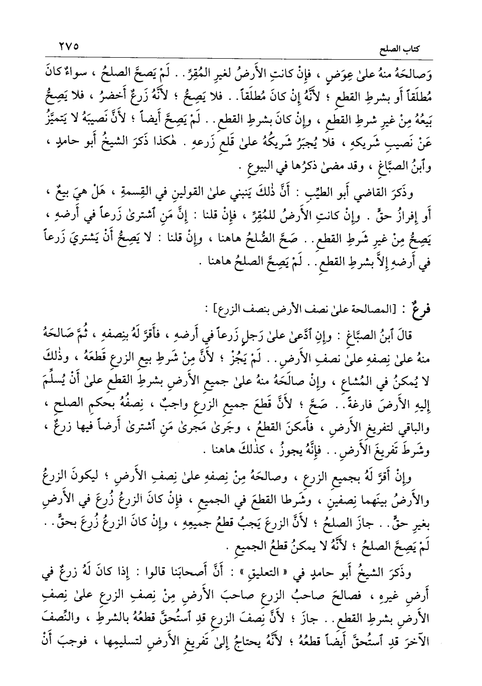 ] : قال ابن الصباغ: وإن ادعى على رجل زرعا في أرضه، فأقر له بنصفه، ثم صالحه منه على نصفه على نصف الأرض.. لم يجز؛ لأن من شرط بيع الزرع قطعه، وذلك لا يمكن في المشاع، وإن صالحه منه على جميع الأرض بشرط القطع على أن يسلم إليه الأرض فارغة.. صح؛ لأن قطع جميع الزرع واجب، نصفه بحكم الصلح، والباقي لتفريغ الأرض، فأمكن القطع، وجرى مجرى من اشترى أرضا فيها زرع، وشرط تفريغ الأرض.. فإنه يجوز، كذلك هاهنا.