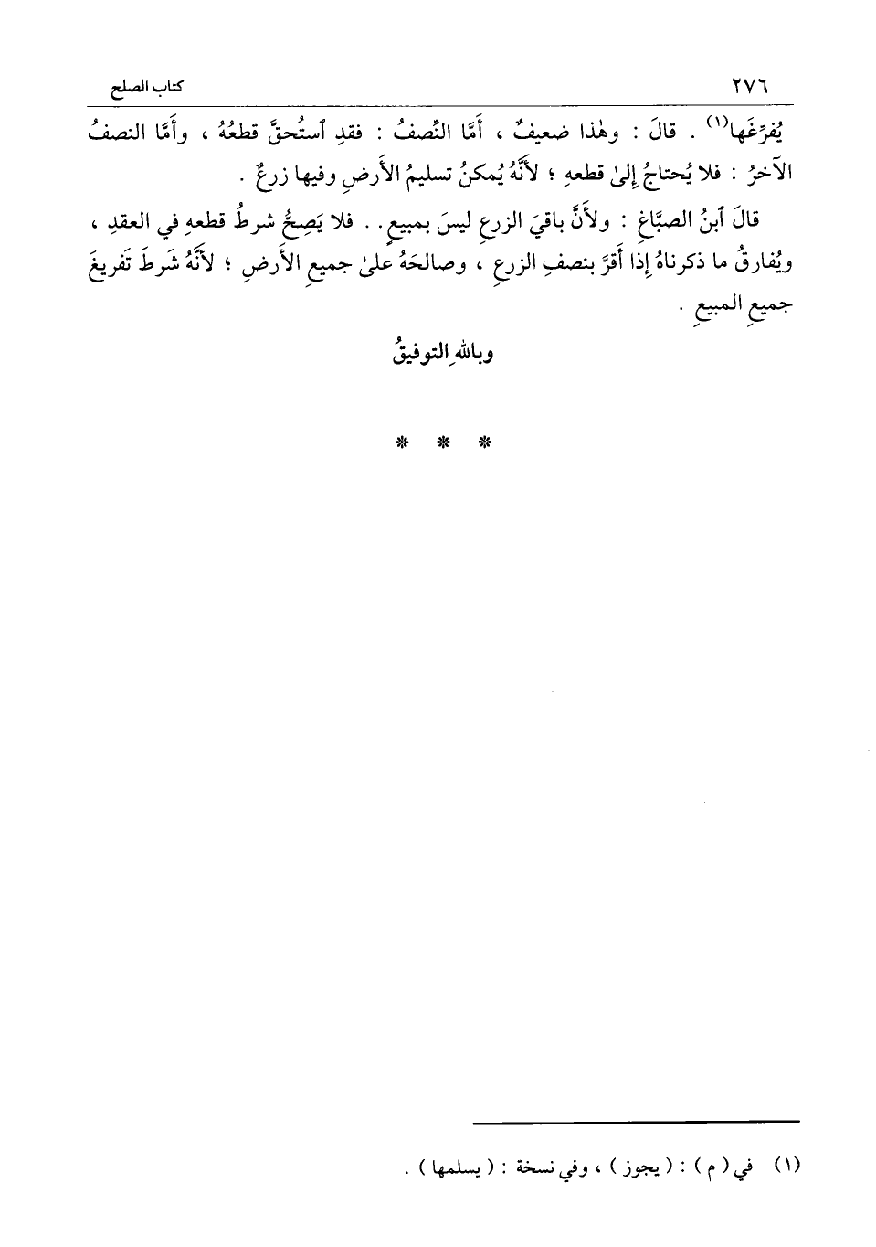 قال ابن الصباغ: ولأن باقي الزرع ليس بمبيع.. فلا يصح شرط قطعه في العقد، ويفارق ما ذكرناه إذا أقر بنصف الزرع، وصالحه على جميع الأرض؛ لأنه شرط تفريغ جميع المبيع.
