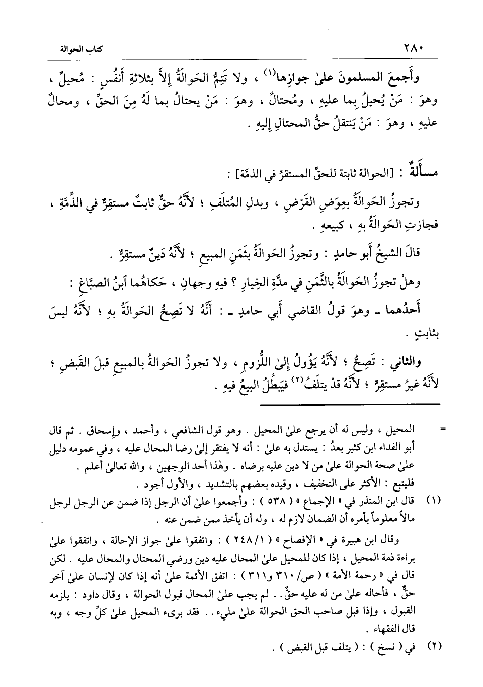 وأجمع المسلمون على جوازها، ولا تتم إلا بثلاثة أنفس: محيل، وهو: من يحيل بما عليه، ومحتال، وهو: من يحتال بما له من الحق، ومحال عليه، وهو: من ينتقل حق المحتال إليه.