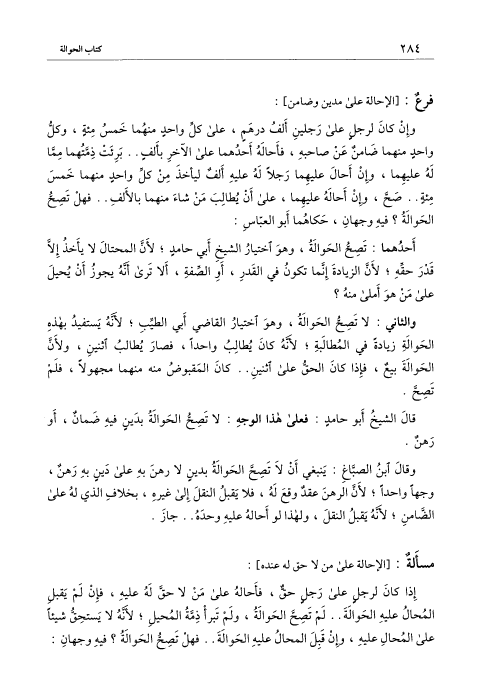 والثاني: لا تصح الحوالة، وهو اختيار القاضي أبي الطيب؛ لأنه يستفيد بهذه الحوالة زيادة في المطالبة؛ لأنه كان يطالب واحدا، فصار يطالب اثنين، ولأن الحوالة بيع، فإذا كان الحق على اثنين.. كان المقبوض منه منهما مجهولا، فلم تصح.