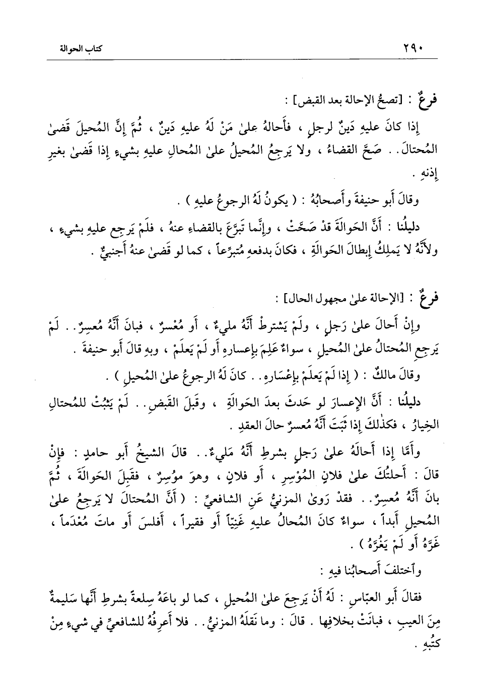 ] : وإن أحال على رجل، ولم يشترط أنه مليء، أو معسر، فبان أنه معسر.. لم يرجع المحتال على المحيل، سواء علم بإعساره أو لم يعلم، وبه قال أبو حنيفة.