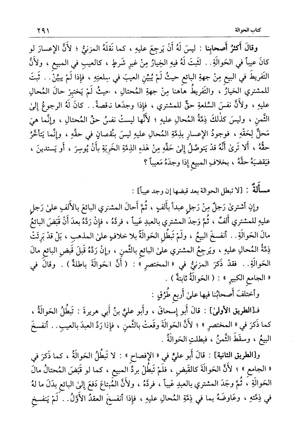 واختلف أصحابنا فيها على أربع طرق: فـ[الطريق الأولى] : قال أبو إسحاق، وأبو علي بن أبي هريرة: تبطل الحوالة، كما ذكر في " المختصر "؛ لأن الحوالة وقعت بالثمن، فإذا رد العبد بالعيب.. انفسخ البيع، وسقط الثمن، فبطلت الحوالة.