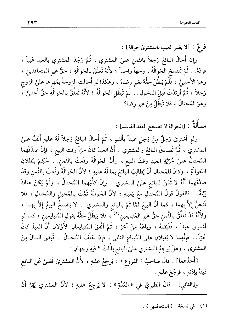 ] : وإن أحال البائع رجلا بالثمن على المشتري، ثم وجد المشتري بالعبد عيبا، فرده.. لم تنفسخ الحوالة، وجها واحدا؛ لأنه تعلق بالحوالة، حق غير المتعاقدين، وهو الأجنبي، فلم يبطل حقه بغير رضاه، وهكذا لو أحالت الزوجة بمهرها على الزوج رجلا، ثم ارتدت قبل الدخول.. لم تبطل الحوالة؛ لأنه تعلق بالحوالة حق أجنبي، وهو المحتال، فلا تبطل من غير رضاه.