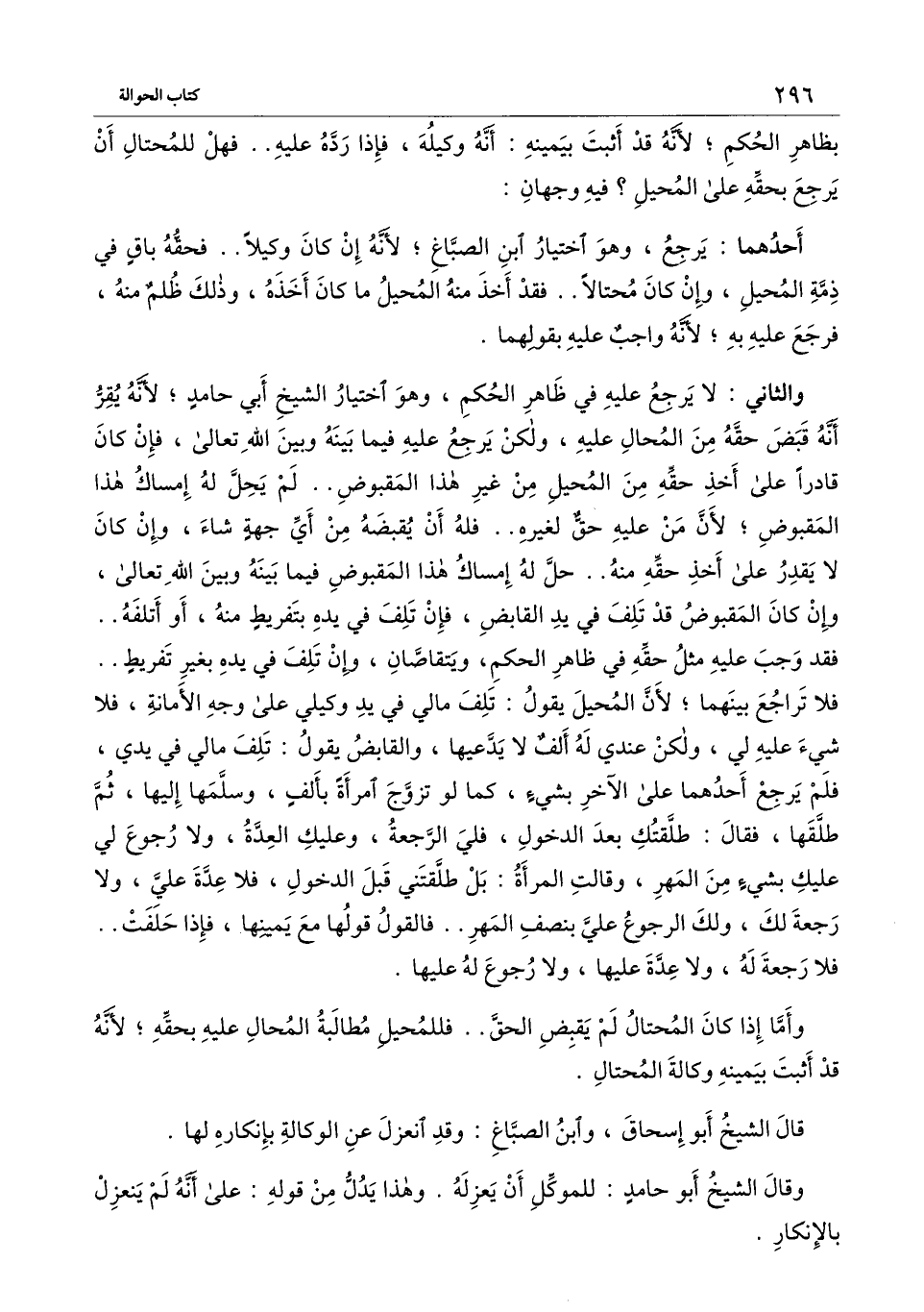 والثاني: لا يرجع عليه في ظاهر الحكم، وهو اختيار الشيخ أبي حامد؛ لأنه يقر أنه قبض حقه من المحال عليه، ولكن يرجع عليه فيما بينه وبين الله تعالى، فإن كان قادرا على أخذ حقه من المحيل من غير هذا المقبوض.. لم يحل له إمساك هذا المقبوض؛ لأن من عليه حق لغيره.. فله أن يقبضه من أي جهة شاء، وإن كان لا يقدر على أخذ حقه منه.. حل له إمساك هذا المقبوض فيما بينه وبين الله تعالى، وإن كان المقبوض قد تلف في يد القابض، فإن تلف في يده بتفريط منه، أو أتلفه.. فقد وجب عليه مثل حقه في ظاهر الحكم، ويتقاصان، وإن تلف في يده بغير تفريط.. فلا تراجع بينهما؛ لأن المحيل يقول: تلف مالي في يد وكيلي على وجه الأمانة، فلا شيء عليه لي، ولكن عندي له ألف لا يدعيها، والقابض يقول: تلف مالي في يدي، فلم يرجع أحدهما على الآخر بشيء، كما لو تزوج امرأة بألف، وسلمها إليها، ثم طلقها، فقال: طلقتك بعد الدخول، فلي الرجعة، وعليك العدة، ولا رجوع لي عليك بشيء من المهر، وقالت المرأة: بل طلقتني قبل الدخول، فلا عدة علي، ولا رجعة لك، ولك الرجوع علي بنصف المهر.. فالقول قولها مع يمينها، فإذا حلفت.. فلا رجعة له، ولا عدة عليها، ولا رجوع له عليها.