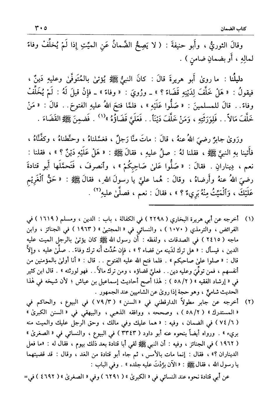 «وروى جابر - رَضِيَ اللَّهُ عَنْهُ -، قال: مات منا رجل، فغسلناه، وحنطناه، وكفناه، فأتينا به النبي - صَلَّى اللَّهُ عَلَيْهِ وَسَلَّمَ -، فقلنا له: صل عليه، فقال - صَلَّى اللَّهُ عَلَيْهِ وَسَلَّمَ -: " هل عليه دين؟ "، فقلنا: نعم، ديناران.. فقال: صلوا على صاحبكم "، وانصرف، فتحملها أبو قتادة - رَضِيَ اللَّهُ عَنْهُ - وأرضاه، وقال: هما علي يا رسول الله، فقال - صَلَّى اللَّهُ عَلَيْهِ وَسَلَّمَ -: " حق الغريم عليك، والميت منه بريء؟ "، فقال: نعم، فصلى عليه» .