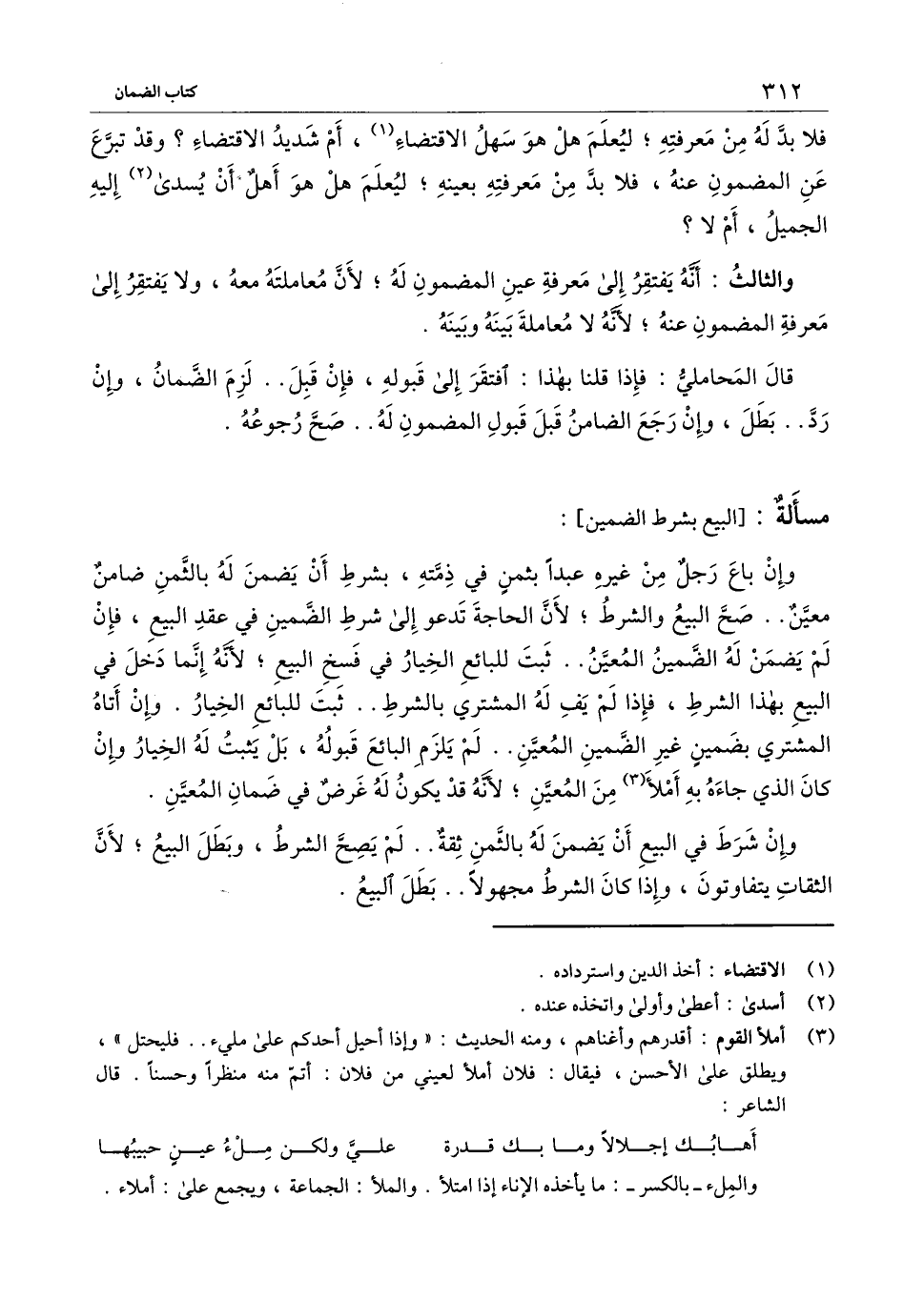 فلا بد له من معرفته؛ ليعلم هل هو سهل الاقتضاء، أم شديد الاقتضاء؟ وقد تبرع عن المضمون عنه، فلا بد من معرفته بعينه؛ ليعلم هل هو أهل أن يسدى إليه الجميل، أم لا؟