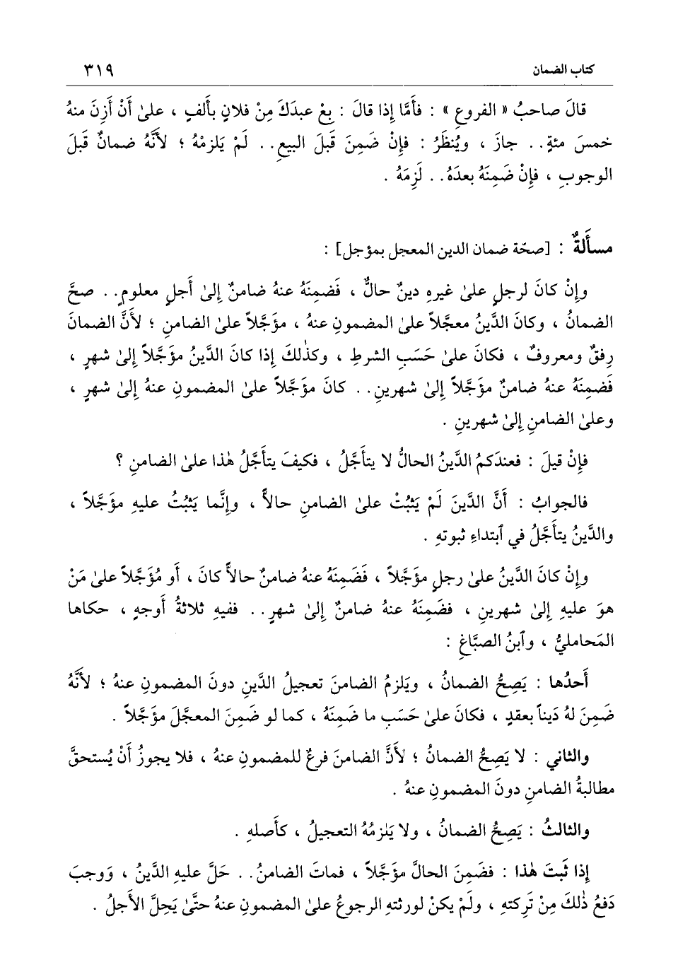 وإن كان الدين على رجل مؤجلا، فضمنه عنه ضامن حالا كان، أو مؤجلا على من هو عليه إلى شهرين، فضمنه عنه ضامن إلى شهر.. ففيه ثلاثة أوجه، حكاها المحاملي، وابن الصباغ: