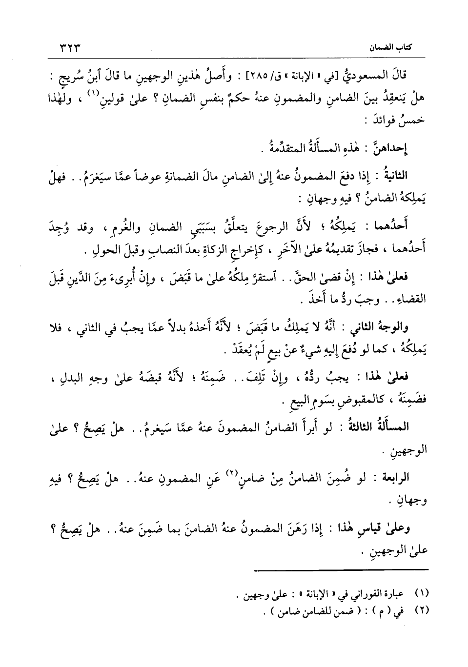 قال المسعودي [في " الإبانة " ق \ 285] : وأصل هذين الوجهين ما قال ابن سريج: هل ينعقد بين الضامن والمضمون عنه حكم بنفس الضمان؟ على قولين، ولهذا خمس فوائد: