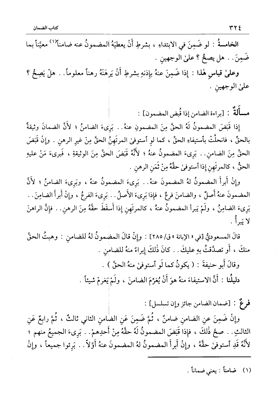 ] : إذا قبض المضمون له الحق من المضمون عنه.. برئ الضامن؛ لأن الضمان وثيقة بالحق. فانحلت باستيفاء الحق، كما لو استوفى المرتهن الحق من غير الرهن. وإن قبض الحق من الضامن.. برئ المضمون عنه؛ لأنه قبض الحق من الوثيقة، فبرئ من عليه الحق، كالمرتهن إذا استوفى حقه من ثمن الرهن.