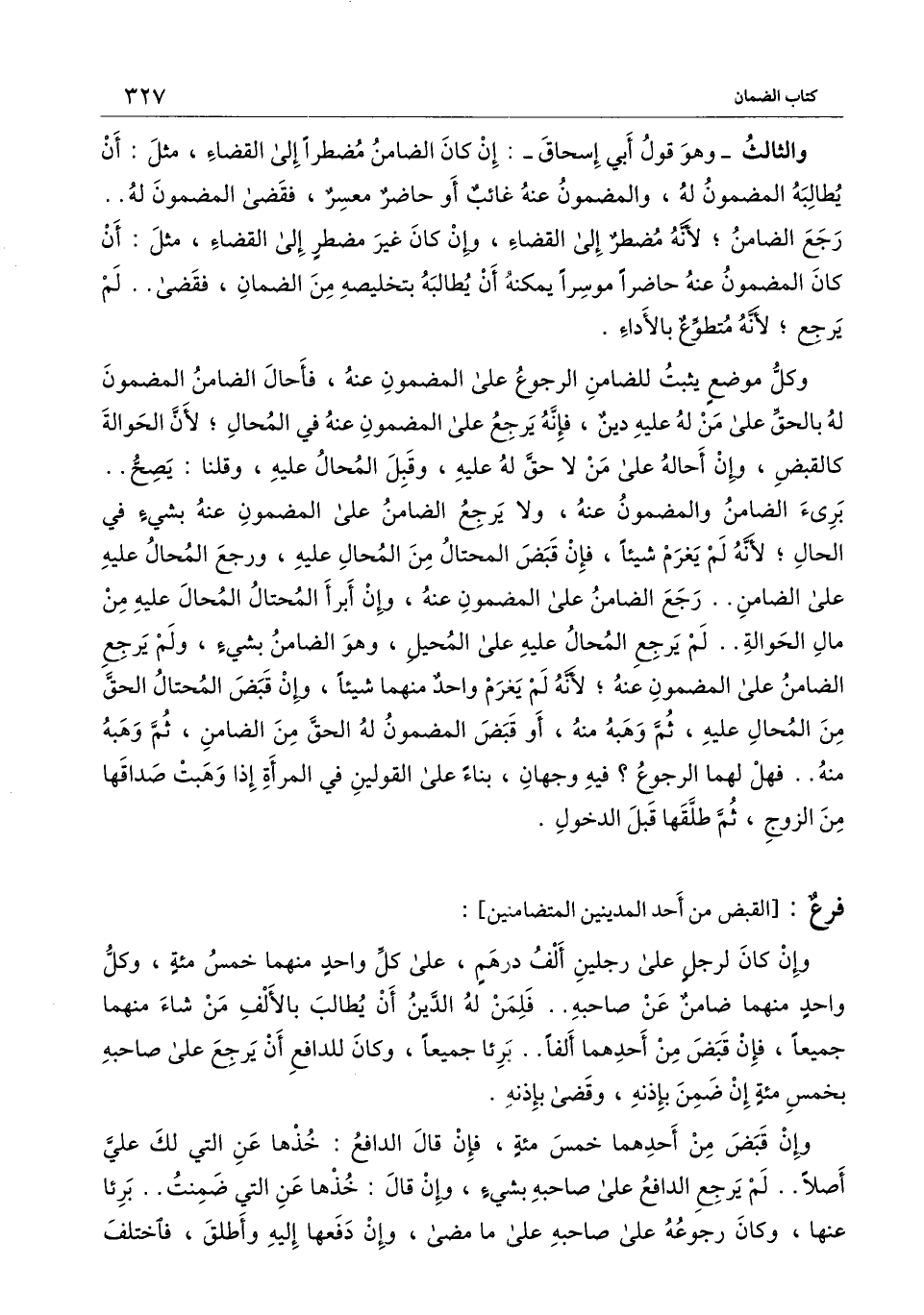 والثالث - وهو قول أبي إسحاق -: إن كان الضامن مضطرا إلى القضاء، مثل: أن يطالبه المضمون له، والمضمون عنه غائب أو حاضر معسر. فقضى المضمون له.. رجع الضامن؛ لأنه مضطر إلى القضاء، وإن كان غير مضطر إلى القضاء، مثل: أن كان المضمون عنه حاضرا موسرا يمكنه أن يطالبه بتخليصه من الضمان، فقضى.. لم يرجع؛ لأنه متطوع بالأداء.