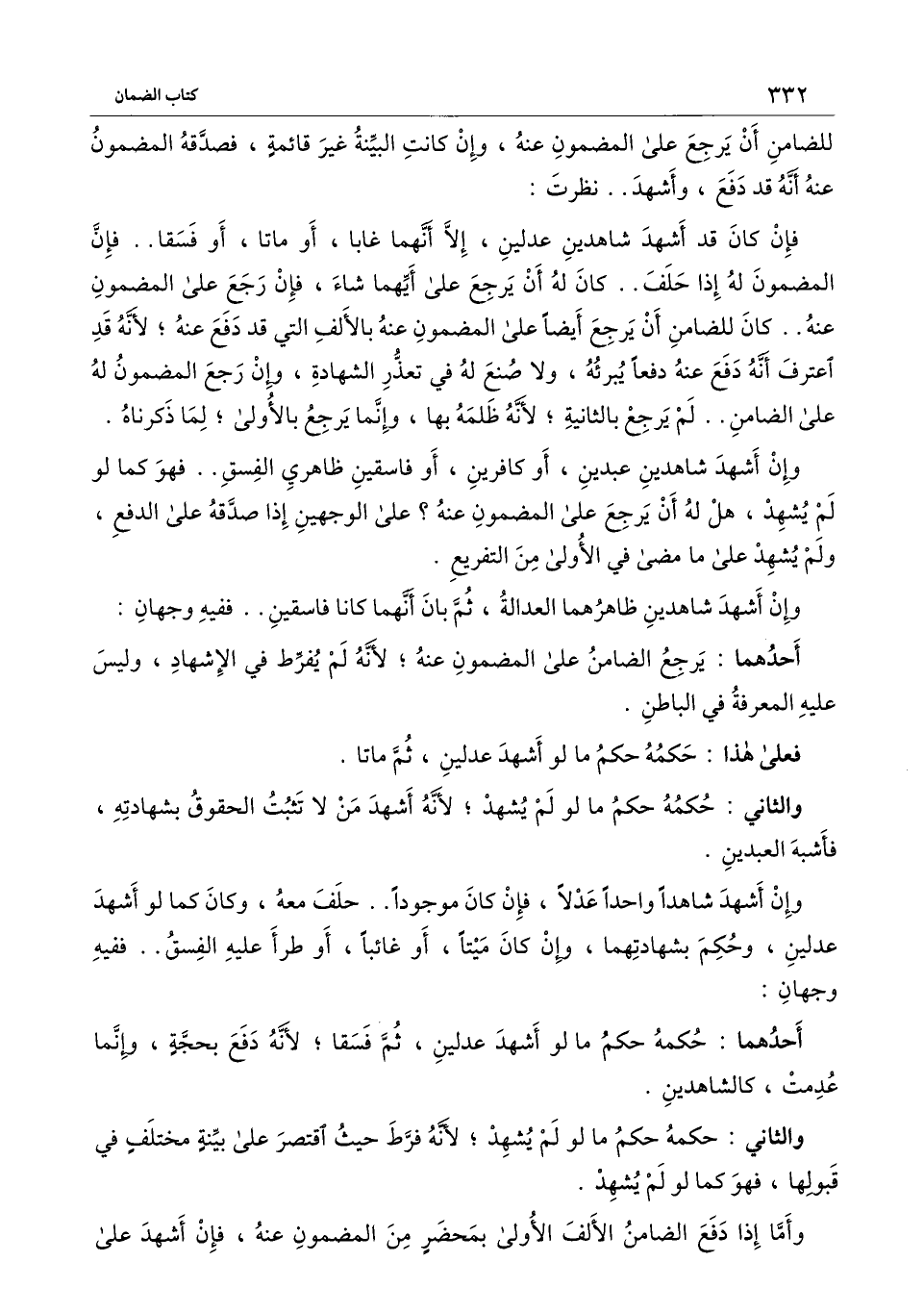 وإن أشهد شاهدين عبدين، أو كافرين، أو فاسقين ظاهري الفسق.. فهو كما لو لم يشهد، هل له أن يرجع على المضمون عنه؟ على الوجهين إذا صدقه على الدفع، ولم يشهد على ما مضى في الأولى من التفريع.